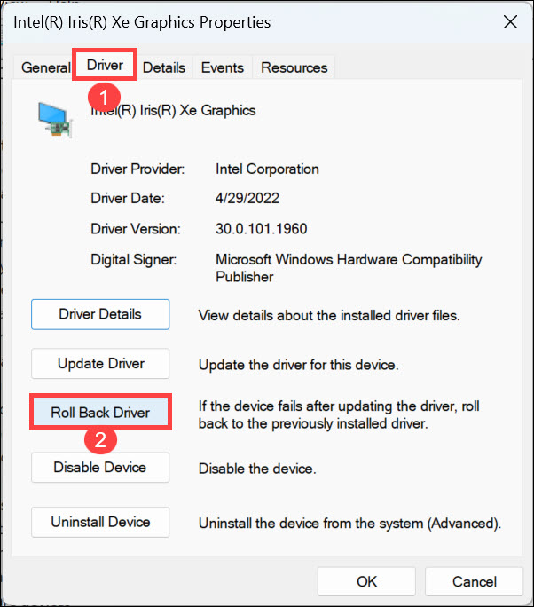 4。に切り替えますドライバタブとクリックしますロールバックドライバー。