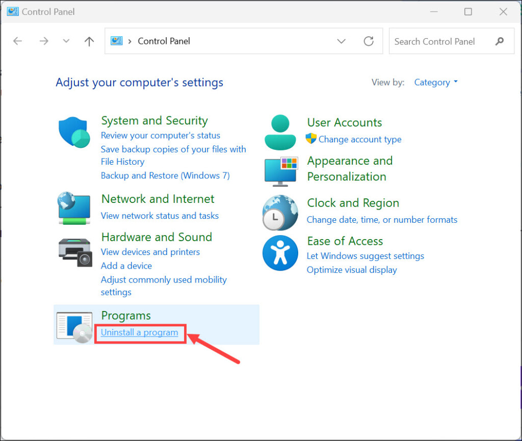 2。次に、クリックしますプログラムをアンインストールします「プログラム」の見出しの下。