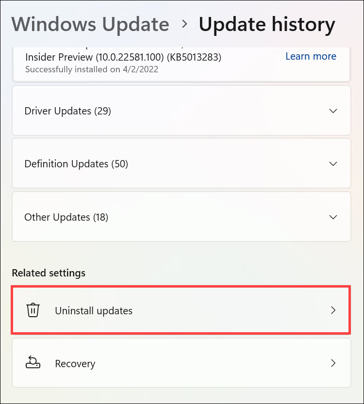 3。更新履歴の下で、クリックします更新をアンインストールします「関連する設定」の見出しの下。