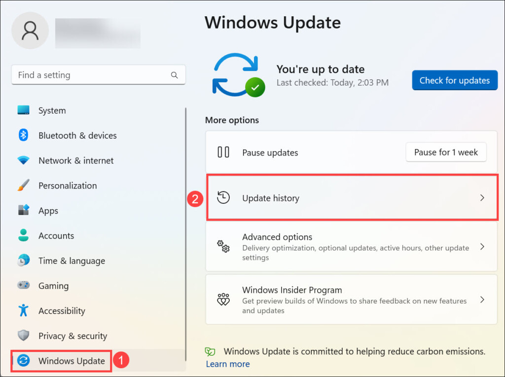 2。に切り替えますWindows Update左側のタブと選択履歴を更新します右側に。