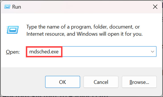 1。プレス 'Windows + r'実行ダイアログとタイプを開くにはmdsched.exe箱に。