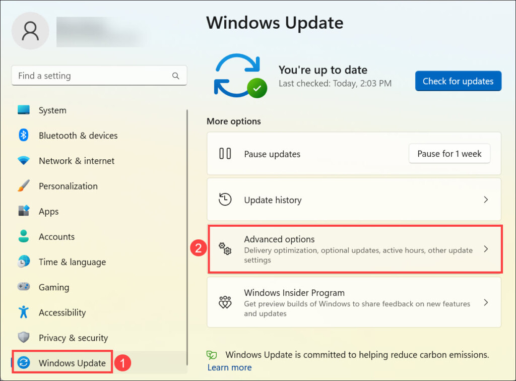 2。に切り替えますWindows Update左側のタブと選択高度なオプション右側に。