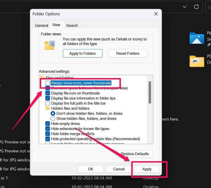 Windows 11でPNGプレビューが機能しない問題を経験したときにチェックしたいと思うかもしれませんが、ファイルエクスプローラーのサムネイルではなく、ウィンドウがアイコンのみを表示するオプションが有効になっているかどうかです。