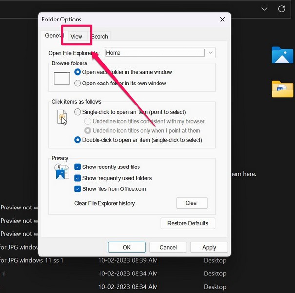 3。でフォルダーオプションウィンドウ、に行きますビュータブ。