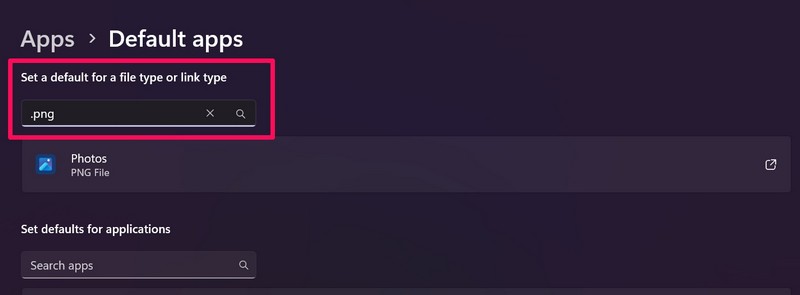 3。入力します.png下の検索バーファイルタイプまたはリンクタイプセクションのデフォルトを設定しますEnterを押します。
