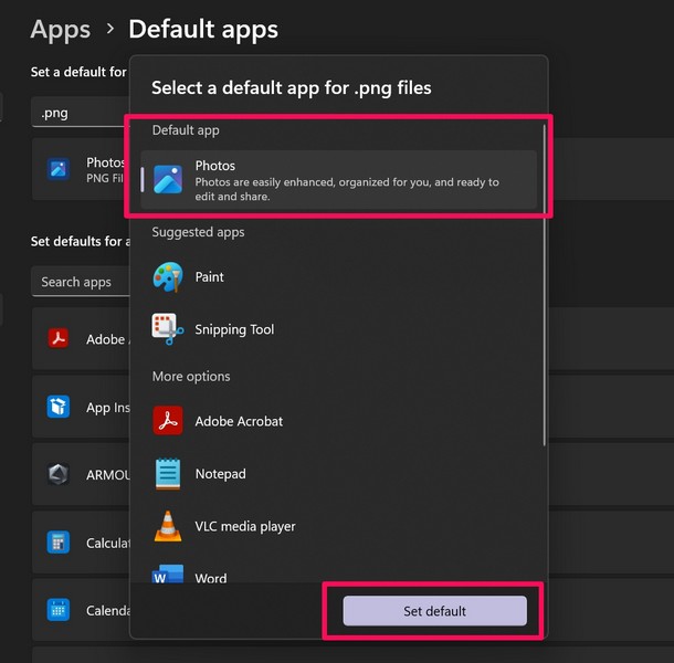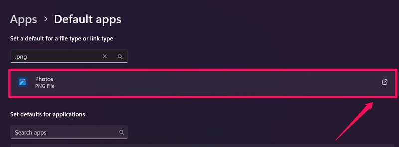 4。の場合写真アプリPNGファイルのデフォルトアプリとして表示されません。検索結果をクリックして、設定されたデフォルトUIを開きます。