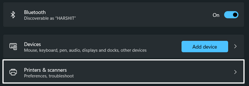 2。でBluetooth&Devicesセクション、をクリックしますプリンターとスキャナーオプションして、プリンターデバイスを選択します。