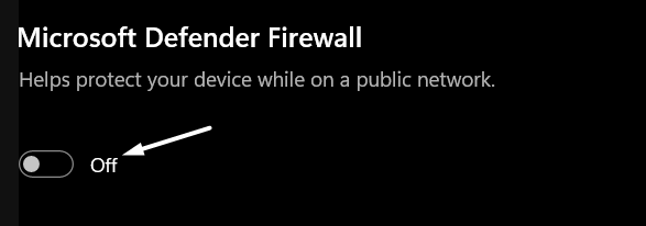 4。完了したら、をクリックしますパブリックネットワーク同じセクションのオプションをオフにしますMicrosoft Defenderファイアウォールトグル。