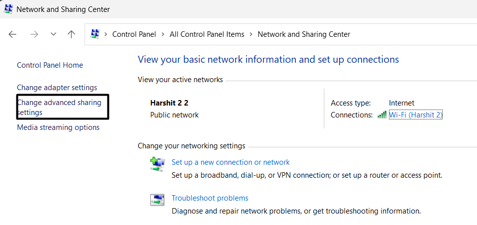 Windows 11 PCでファイルとプリンターの共有を有効にするには、上記のパスに進みます。