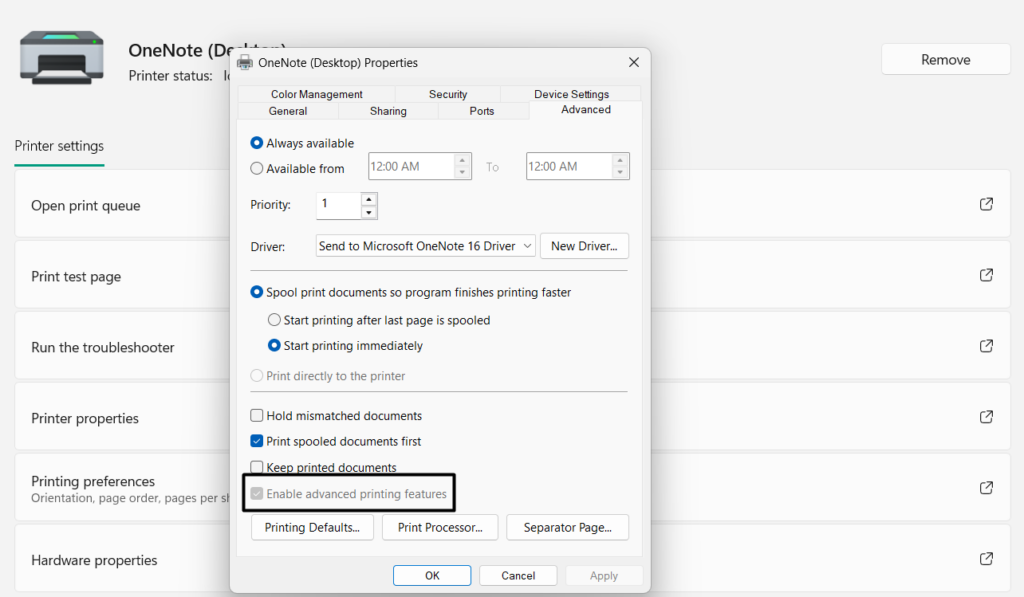 3。に移動します高度なタブとチェックを外します高度な印刷を有効にします 特徴オプション。