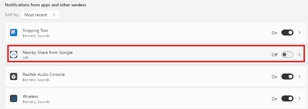 4。下にスクロールしますアプリやその他の送信者からの通知セクションとクリックしますGoogleから近くの共有アプリ。