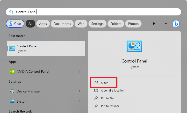 1。開きますスタートメニュー、 タイプコントロールパネル、そしてクリックします開けるオプション。