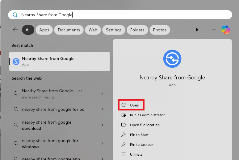 5。Googleから近くの共有を検索して、クリックします開けるオプション。
