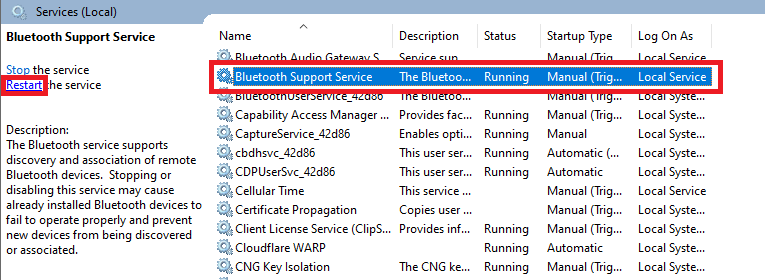 2。クリックしてくださいBluetoothサポートサービス選択します再起動オプション。