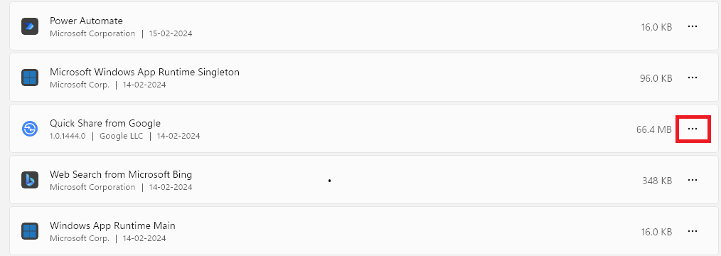 3。検索するGoogleからのクイックシェアそして、その横にあるミートボールメニューをクリックします。