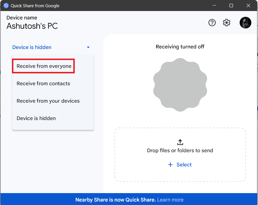 Google Quick Share PCアプリケーションでの可視性設定が誤っていないことも、接続プロセスに競合を引き起こす可能性があります。たとえば、PCにファイルを送信しているが、可視性の設定は隠れた、検索には表示されません。