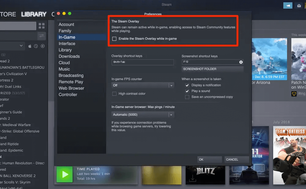 ステップ4:ゲーム内のタブを選択し、ゲームプレイ中にSteamオーバーレイを有効にするためのチェックボックスを選択します。