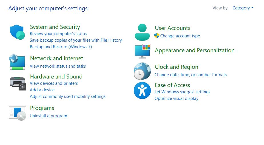 コントロールパネルウィンドウで、「システムとセキュリティ」カテゴリをタップします。