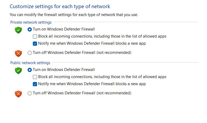 次に、パブリックネットワーク設定とプライベートネットワーク設定の両方の「Windows Defenderファイアウォールをオフにする」オプションをタップします。