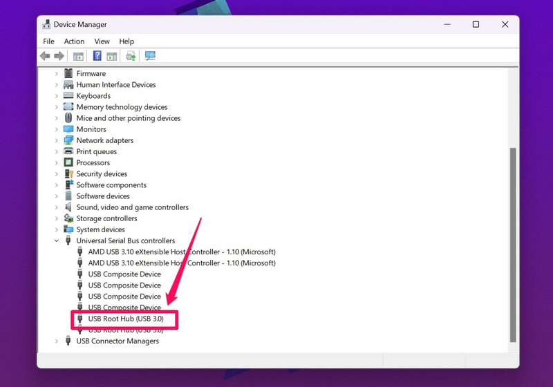 3。リストで、を見つけますUSBルートハブ(USB 3.0)オプションとダブルクリックしますそのプロパティを開く。