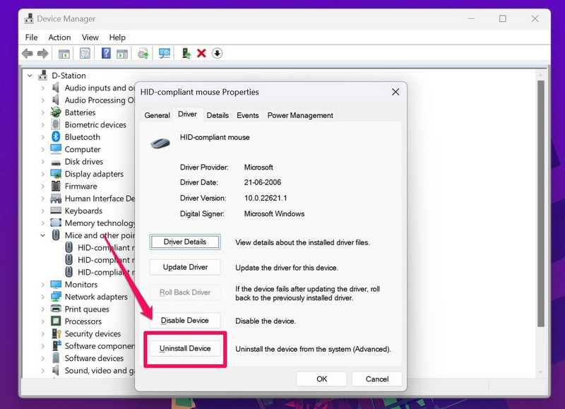 Windows 11 PCまたはラップトップでマウスドライバーを更新しても、右クリックのない問題を修正しなかった場合、次に試すことができるのは、デバイスのドライバーを再インストールすることです。それを行うには、下の手順に従ってください。