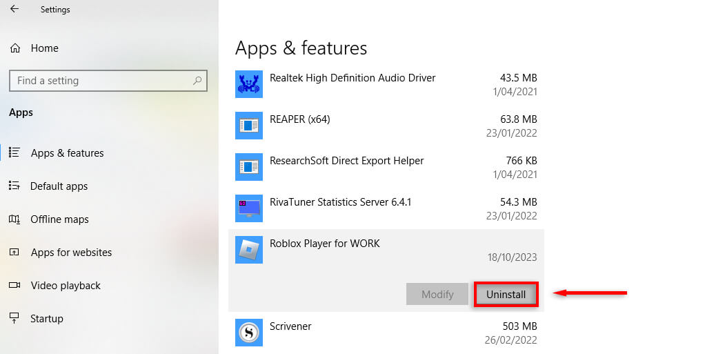 - 下にスクロールして、見つけますRoblox、および選択しますアンインストール。