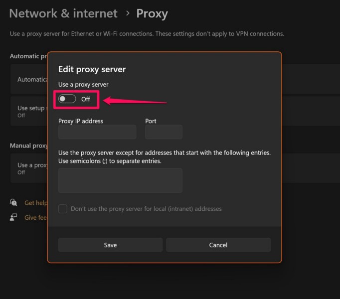 5。次のウィンドウ内で、[トグル]をクリックしますのためにプロキシサーバーオプションを使用しますWindows 11 PCまたはラップトップで無効にします。