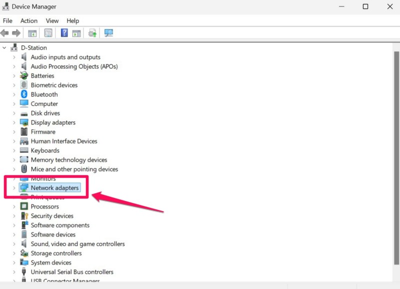 3。を見つけますネットワークアダプターデバイスマネージャーウィンドウ内のセクション矢印をクリックして展開します。