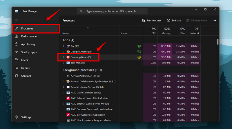 2。の下プロセス左のナビゲーションバーのタブ、lSamsungノートアプリをOCATEそしてシングルクリックして選択します。