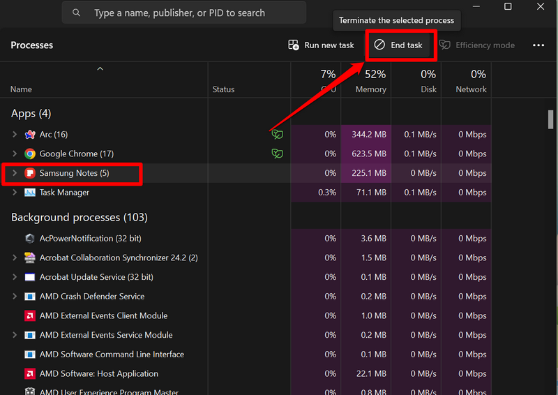 したがって、Windows 11 PCまたはラップトップのSamsung Notesアプリを強制的に閉じて、再起動して、次のように閉じます。