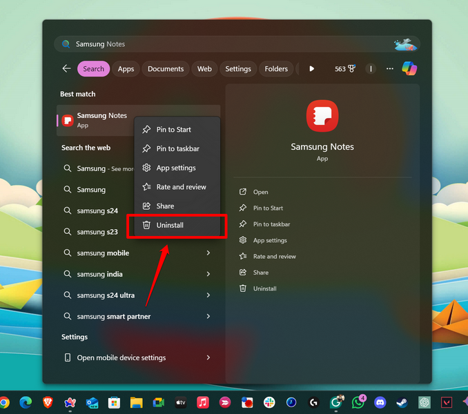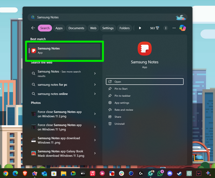 4。次に、Windows + Sを使用してWindows検索を開き、Samsung Notesアプリを見つけ、アプリアイコンをクリックしてWindows 11 PCまたはラップトップで再起動します。