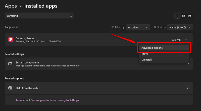 1。前のセクションからの手順を使用しますAdvanced Optionsページに移動しますWindows Settingsアプリ内のSamsung Notesアプリの場合。