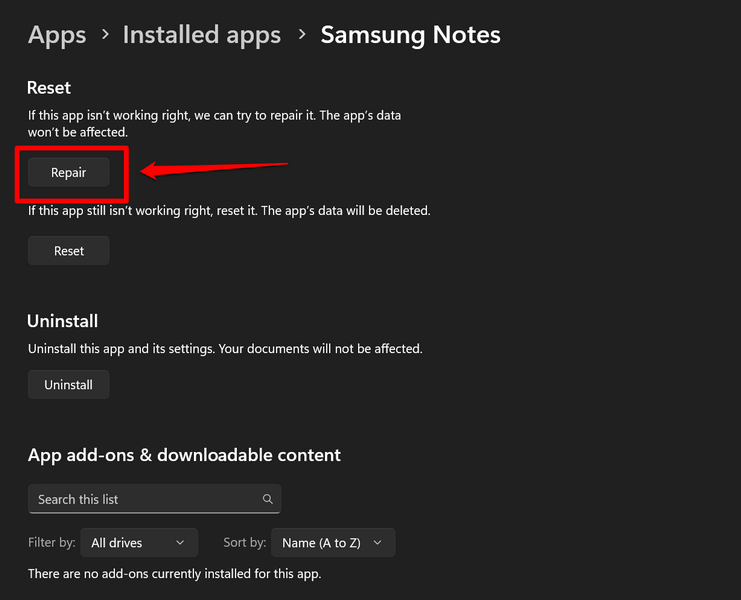 Windows 11 PCまたはラップトップのSamsung Notesアプリを修復するには、次の手順に従ってください。