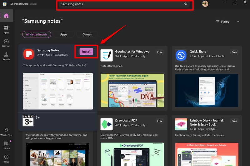 6。上記の検索バーを使用しますSamsung Notesアプリを見つけますそしてヒットしますボタンをインストールしますWindows 11デバイスにアプリを再インストールします。