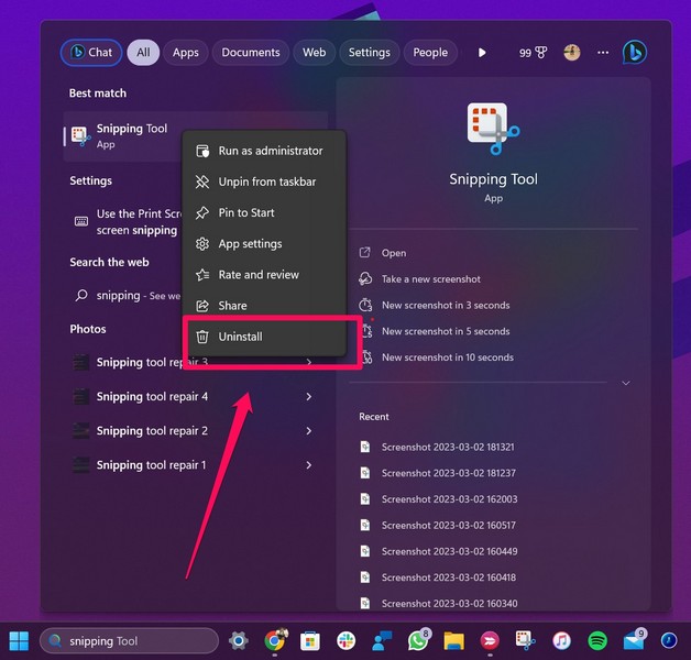 2。検索結果ページで、スニッピングツールを右クリックしますアプリとクリックしますアンインストールコンテキストメニューのボタン。