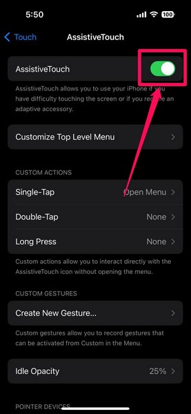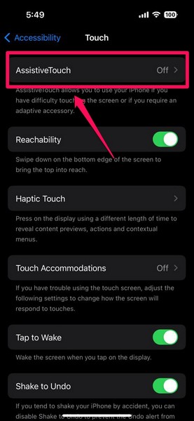10。今、アシストタッチページに戻りますそして同じようにトグルをタップしますiPhoneで有効にします。
