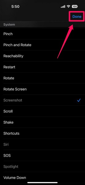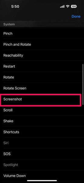 6。を見つけますスクリーンショットオプション次の関数のリストとタップして選択します。