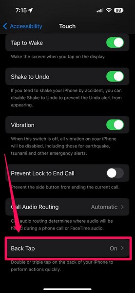 5。次のページで、2つのバックタップジェスチャーのいずれかを選択しますスクリーンショット関数を割り当てますタップして開きます。