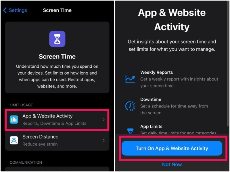 したがって、iPhoneの日付と時刻の設定を変更した後に画面の時間をオンにしたい場合は、単に開くことができます画面時間[設定]ページをタップしますアプリとウェブサイトのアクティビティ下のオプション使用法を制限しますセクション、および次のスプラッシュ画面でアクションを確認してください機能を再度可能にします。