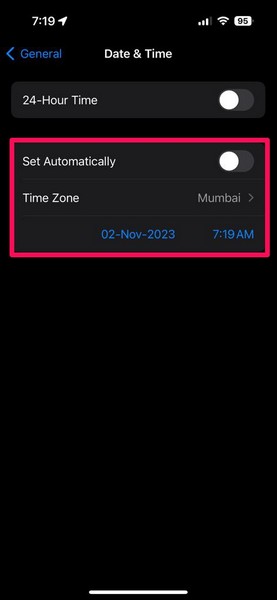 に行きます日付と時刻設定の再開後の設定ページ。 SETは、Grayed-Outの問題を自動的に切り替え、iOSデバイスで修正する必要があります。