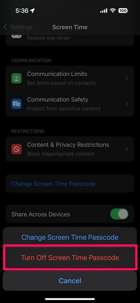 4。次のプロンプトで、をタップします画面タイムパスコードをオフにしますオプション。