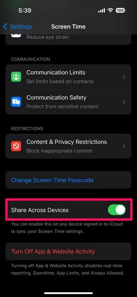 したがって、iPhoneの画面時間設定でデバイス全体で共有をオフにすると、セットが自動的にグレー化された問題を解決し、トグルを再生します。あなたはそれを行うために下の手順に従うことができます: