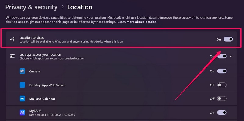 3。ここで、のトグルをクリックしますロケーションサービスデバイスで有効にするオプション。