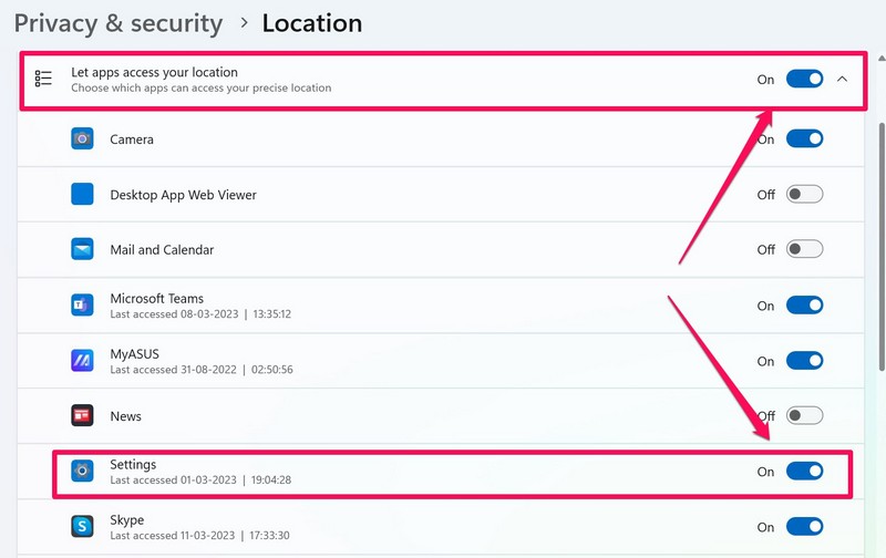 4。あなたがそれにいる間、有効にしてくださいアプリにあなたの場所にアクセスさせます同様にオプションを付けて、トグルを確認してください設定リストで有効になります。