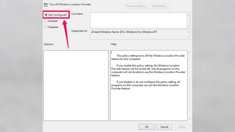 Computer Configuration > Administrative Templates > Windows Components > Location and Sensors > Windows Location Provider > Turn off Windows Location Provider.4。ここで、の値を設定しますWindowsロケーションプロバイダーをオフにしますASのオプション構成されていませんそしてヒットします適用するボタン。