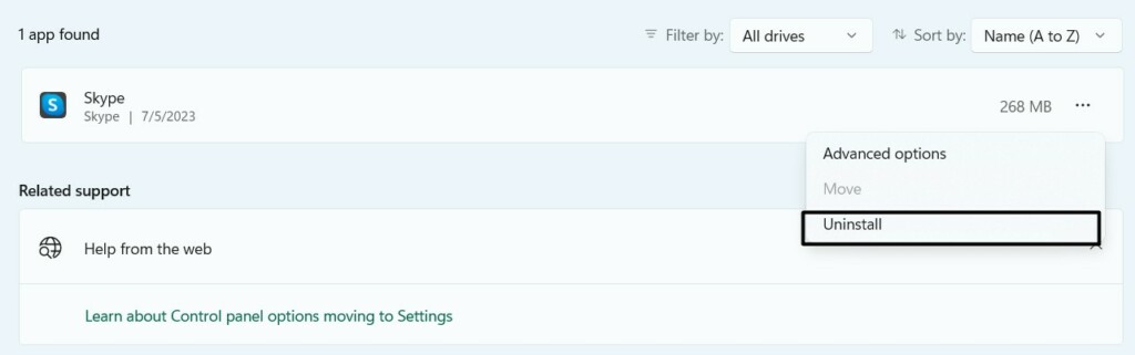 2。クリックします3つのドット(…)Skypeの隣で選択しますアンインストールドロップダウンメニューからオプション。
