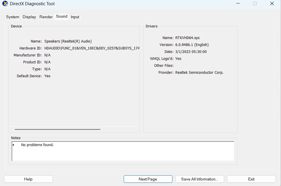 3。完了したら、に行きます音のタブDirectX診断ツールウィンドウとチェックしますメモエリア。の場合メモセクションでは、何らかの問題に言及し、インターネットでそれらを検索して修正します。また、にも行く必要がありますオーディオウィンドウのタブとそこに同じものを確認します。
