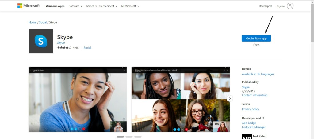 3。アンインストールされたら、クリックしますSkypeのMicrosoft Storeページにアクセスしてクリックしますストアアプリを入手してください。