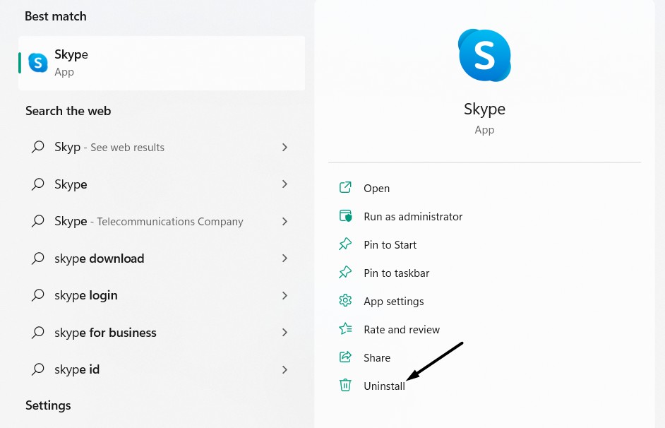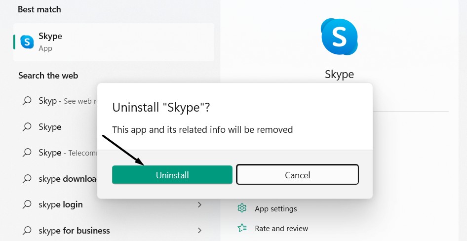 1。を検索しますSkypeアプリWindows検索を使用してクリックしますアンインストール結果のボタン。