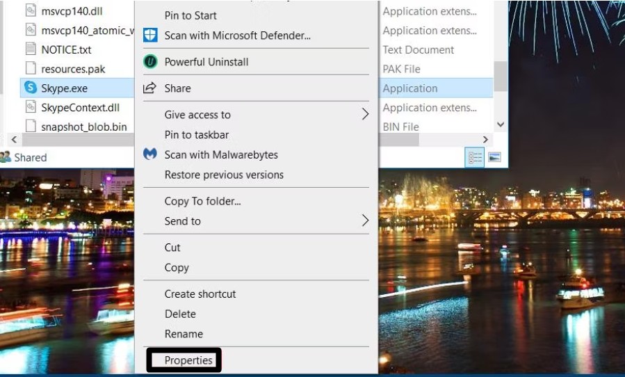 C:Program FilesWindowsAppsMicrosoft.SkypeApp_15.92.3204.0_x86__kzf8qxf38zg5cSkype2。そこに着いたら、右クリックしますSkypeアプリ、および選択しますプロパティコンテキストメニューから。